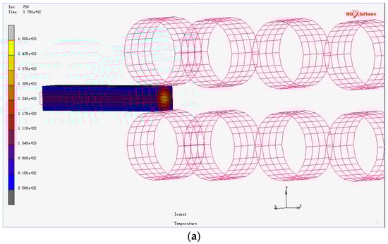 (a) Schematic diagram of 3D thermal–mechanical coupled simulation by MSC Marc; (b,c) morphology and temperature distribution contour maps of transverse cross sections obtained from thermal–mechanical coupling simulation (b) before; and (c) after reduction in a specific casting condition.