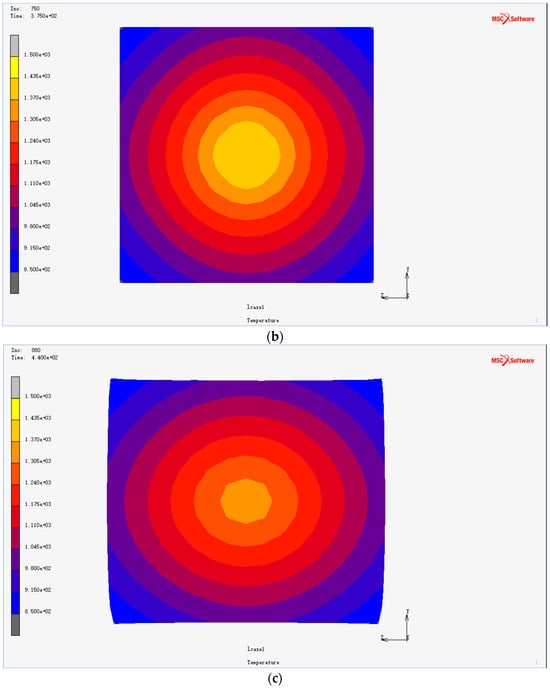 In the simulated reduction process, reduction rollers were regarded as rigid bodies without deformation, while the billet was treated as a deformable body. The friction coefficient between the reduction roller and the billet was assumed to be 0.3. The billet length and cross section were set as 1000 mm and 160 mm × 160 mm, respectively. The schematic diagram of 3D thermal–mechanical coupled model of the reduction process is shown in Figure 3a, and the typical morphology and temperature distribution contour maps of transverse cross sections at different distances from the meniscus in a specific casting condition with reduction process are illustrated in Figure 3b,c for instance.