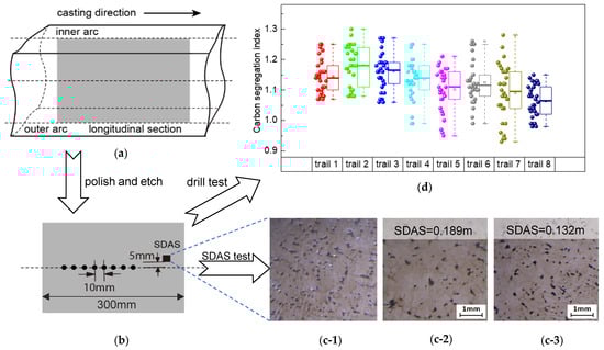 Schematic diagram of sampling and test: (a) billet sampling position in longitudinal section; (b) sampling positions for carbon segregation test and dendrite investigation; (c) dendrite morphology for the core part of billets obtained from (c-1) trial 1; (c-2) trial 2; and (c-3) trial 3; (d) carbon segregation indexes for different trials.