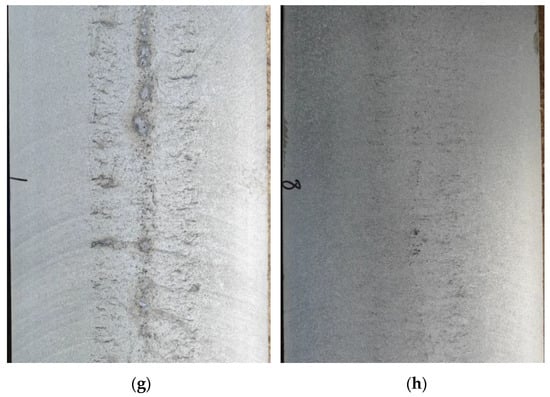Longitudinal section macrostructure of billets obtained from (a) trial 1; (b) trial 2; (c) trial 3; (d) trial 4; (e) trial5; (f) trial 6; (g) trial 7; and (h) trial 8.