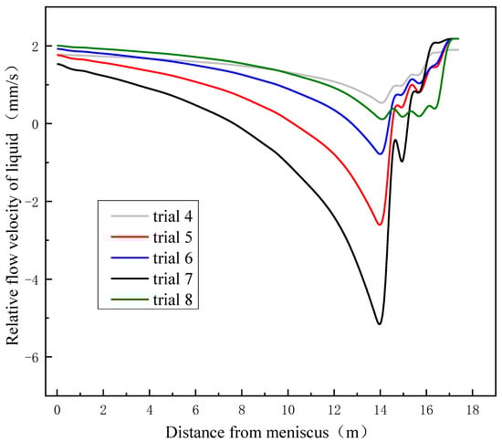 In trial 7, when the reduction is mainly applied in the lower central solid fraction zones, mid-cracks occur with a big fluctuation of macrosegregation both negatively and positively. The test result of trial 7 agrees well with the research work from other researchers [27,31], that is the crack sensitivity increases with the decrease of solidified shell thickness. In this case, excessive backward flow of the central liquid core is caused by the reduction as shown in Figure 6, resulting in obvious inverse segregation. In the reduction zone with higher fs values of trial 7, the decrease both in reduction amount and reduction efficiency leads to a very weak effect on the inhibition of relative flow of the liquid phase, which is distinctly indicated by Figure 6. As a result, serious positive segregation also existed in this case. In the case of trial 8, the reduction amount is the same as trial 4 and trial 7, however, the distribution is further optimized. With the optimized reduction distribution as stated in trial 8, it is not difficult to find from Figure 6 that the flow velocity of liquid is maintained stably at a relative low value, indicating a steady retard of liquid flow, and can effectively improve the macrosegregation of billet without causing other inner defects, which has been evidently shown as in Figure 5 and Table 4.