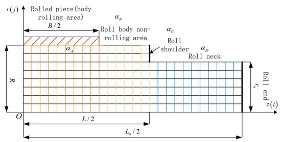By using the finite difference method, the roll is divided into several equal grids. The grid division is shown in Figure 2, where is the radial coordinate and is the axial coordinate. The origin is situated at the center of gravity of the roll. The middle section of the body is symmetrically distributed, prompting the selection of a quarter section through the roll axis as the focal point for research. Subsequently, a differential scheme for the temperature distribution across the entire grid system is established. Equation (2) is the differential expression of the roll thermal balance equation [24].