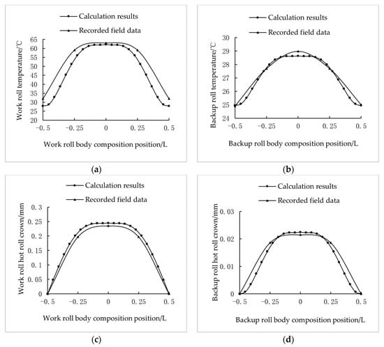 Comparing the curves of the calculation results and field data. (a) Work roll temperature field comparison; (b) backup roll temperature field comparison; (c) work roll hot roll crown comparison; (d) backup roll hot roll crown comparison.