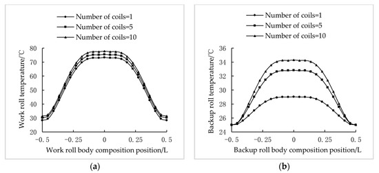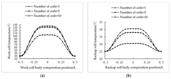Roll temperature field with cooling water. (a) Change curve of the work roll temperature field with different numbers of rolling strip coils; (b) change curve of the backup roll temperature field with different numbers of rolling strip coils.