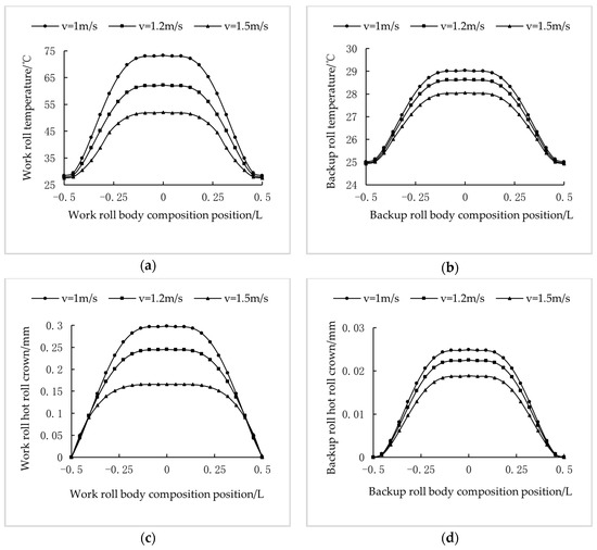 Roll temperature field and hot roll crown at different speeds. (a) Change curve of the temperature field of the work roll under different flow rates; (b) change curve of the temperature field of the backup roll under different flow rates; (c) change curve of the hot roll crown of the work roll at different flow rates; (d) change curve of the hot roll crown of the backup roll at different flow rates.