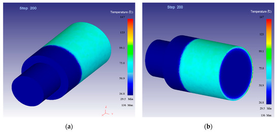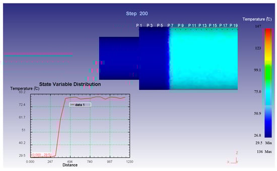Through simulation, it was observed that, during the roll’s operation at a rolling speed of 4 m/s, it reaches the steady state of the temperature field. The temperature field distribution is illustrated in Figure 11. After completing the calculation, 19 measuring points were evenly distributed along the roll body during the rolling steady state. The temperature calculation values at these measuring points were extracted to generate the temperature distribution curve along the direction of the roll body, as illustrated in Figure 12. The average temperature of the roll surface in the non-rolling area is 29.7 °C, while in the rolling area, it averages at 78.8 °C. Notably, there exists a temperature transition area approximately 123.7 mm wide between these two regions [31].