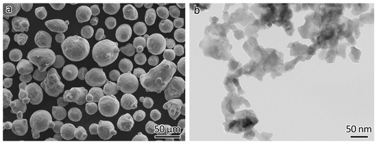 Commercial gas-atomized 316L powder (Höganäs AB, Höganäs, Sweden) was used as feedstock. The mean size was 42.3 µm (D10: 26.3 µm, D50: 39.8 µm, D90: 60.9 µm) as measured using a laser light-scattering size distribution analyzer. The chemical composition was as follows (wt%): Cr 16.8%, Ni 12.7%, Mo 2.5%, Mn 1.5%, Si 0.7%, and C 0.011%. The morphology of the 316L powder is shown in Figure 1a. The reinforcement consisted of Y2O3 nanoparticles (Nanostructured & Amorphous Materials, Inc., Houston, TX, USA). The vendor claimed that the size distribution was 30–45 nm. The actual size distribution was measured manually and resulted to be about 10–90 nm, with an average size of 42 nm. The morphology of the particles, as shown in Figure 1b, was obtained using transmission electron microscopy (JEOL 2010, JEOL Ltd., Tokyo, Japan).