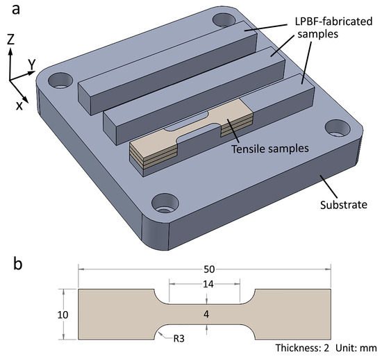 (a) Illustration showing the LPBF-fabricated samples and the locations of the tensile samples, (b) dimensions of the tensile sample.