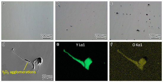 Optical images showing defects in (a) 316L, (b) 316L-0.3Y2O3, and (c) 316L-1.0Y2O3. (d) SEM image showing an agglomeration of Y2O3 nanoparticles in 316L-1Y2O3. EDS map showing the distribution of (e) Y and (f) O in the agglomeration.