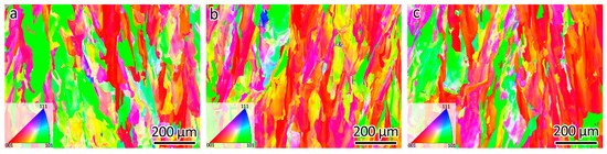 Figure 6 shows the EBSD orientation maps of the LPBF-fabricated 316L, 316L-0.3Y2O3, and 316L-1.0Y2O3 samples. 316L stainless steel fabricated using a forging process usually contains equiaxed grains with a high fraction of twin boundaries [3]. It can be seen that the grains of the LPBF samples under EBSD exhibited a stripe-like pattern. This pattern can be attributed to the epitaxial growth mode characteristic of the LPBF process. Notably, epitaxial grains within this sample demonstrated a <001> texture, showing a preferential alignment along the direction of the maximum temperature gradient, which corresponded to the building direction.