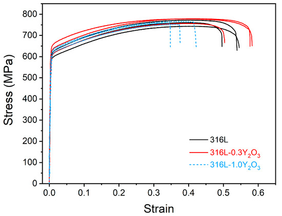 The stress–strain curves of the 316L, 316L-0.3Y2O3, and 316L-1.0Y2O3 steels are presented in Figure 7. The tensile results are compared in Table 1. Gao et al. [21] reported that 316L ODS steel fabricated using the spark plasma sintering process has a low UTS of 348 MPa with an elongation of 17.8%. Leo et al. [33] reported that 316L ODS steel has a yield strength of 458 MPa and a UTS of 723 MPa with an elongation of 46% when fabricated using the mechanical alloying process. The mechanical properties of the LPBF-fabricated 316L ODS steel appeared to be better than those of the mechanically alloyed one. According to the ASTM-A240 standard [34], for 316L, the minimum yield strength is 170 MPa, UTS is 485 Mpa, and elongation is 40%. The LPBF-fabricated 316L showed a good combination of high strength and ductility.