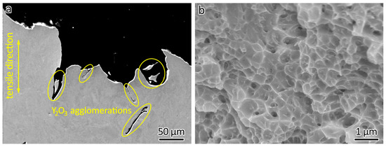After the tensile tests, the fractographic features of the printed samples were further studied using SEM. Y2O3 agglomerations could be seen the fraction points, as shown in Figure 8a. The poor bonding between the Y2O3 agglomerations and the 316L matrix and the sharp corners of the agglomerations caused premature fractures during the tensile test, because fractures form easily in the presence of defects. Therefore, decreased elongation was obtained in the LPBF-fabricated 316L ODS steels.