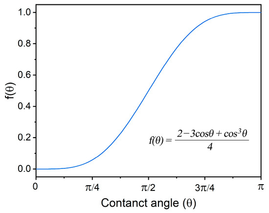 Here, is the free energy needed for heterogeneous nucleation; is the free energy needed for homogenous nucleation; and θ is the contact angle. The curve describing is shown in Figure 9. It can be seen that good wettability (small contact angle) is preferable for grain refinement. It is worthy to point out that there is no significant difference in grain refinement if the contact angle is smaller than 45°. When the contact angle is 90°, the value of is 0.5, which means that the free energy needed for heterogeneous nucleation is half of that required for homogenous nucleation. Consequently, the manifestation of poor wettability in this scenario significantly alters the dynamics of nucleation processes, leading to a lack of substantial grain refinement in the resultant microstructures.
