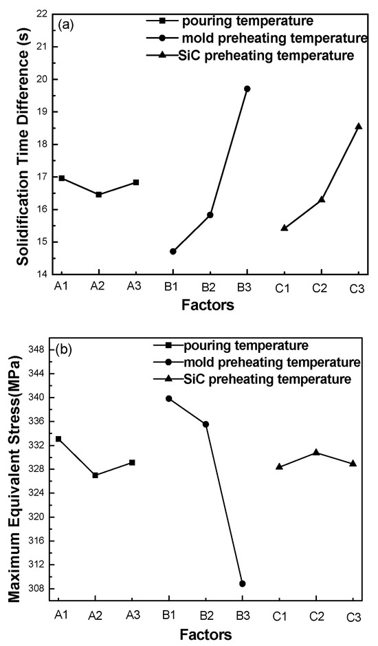 - The orthogonal test showed that the mold preheating temperature was the most crucial determinant of the solidification time difference and maximum equivalent stress. Under a pouring temperature of 700 °C, mold preheating temperature of 200 °C, and SiC skeleton preheating temperature of 600 °C, the maximum principal stress at the bottom of the products was decreased by about 41.9%, and the shrinkage volume inside the composite was decreased about by about 61.6%. By adjusting the initial preheating temperature of various components, the squeeze-casting SiC3D/Al composites could achieve better performance and fewer internal defects, which have been proven through practical experiments.