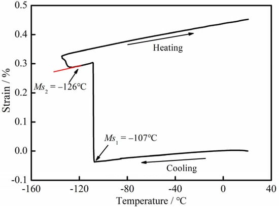 In this experiment, Fe–32Ni alloy was used as the research object, and the chemical composition was as follows: Fe-0.002C-32.65Ni-0.005Si-0.001Mn-0.3Al (wt.%). The samples were smelted in a vacuum induction furnace, cast and forged into round bars with the dimensions of Φ40 mm × 600 mm. Then, the round bars were annealed at 800 °C for 30 min and air cooled to room temperature. The martensitic transformation starting temperature (Ms) of the samples was measured by a DIL 402C (Netzsch, Germany) dilatometer, as shown in Figure 1. When the samples were cooled below room temperature, there two respective Ms temperatures were obtained by the tangential method (red line), −107 °C and −126 °C.