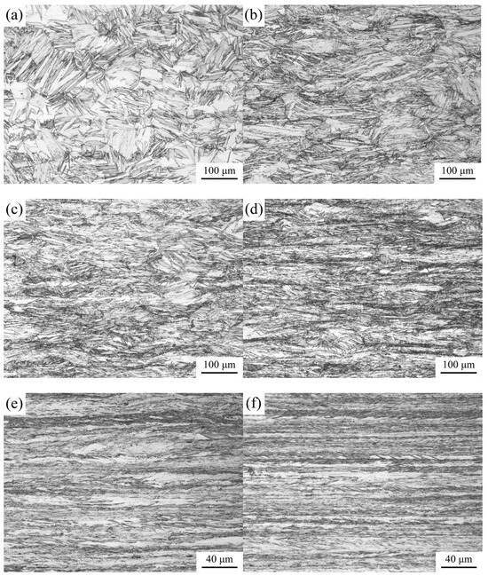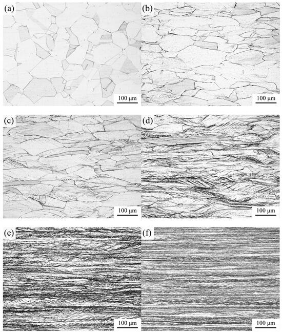 The optical images of the samples after cold rolling and cryogenic treatment: (a) 0%-CR–CT; (b) 42%-CR–CT; (c) 55%-CR–CT; (d) 70%-CR–CT; (e) 85%-CR–CT; (f) 90%-CR–CT.