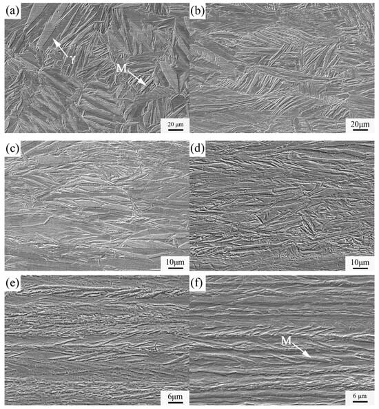 The SEM images of the samples after cold rolling and cryogenic treatment: (a) 0%-CR–CT; (b) 42%-CR–CT; (c) 55%-CR–CT; (d) 70%-CR–CT; (e) 85%-CR–CT; (f) 90%-CR–CT. Notes: γ—austenite, M—martensite.