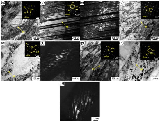 The TEM images of the samples treated by different treatments: (a) 85%−CR; (b) 0%−CR−CT; (c) dark field TEM image corresponding to (b); (d,e) 70%−CR−CT; (f) dark field TEM image corresponding to (e); (g,h) 90%−CR−CT; (i) dark field TEM image corresponding to (h). Notes: M—martensite.