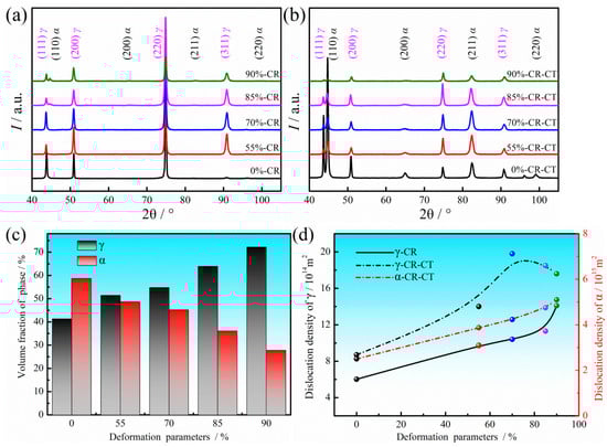 (a,b) XRD patterns; (c) phase fraction–rolling deformation degree curves of the CR–CT samples; (d) dislocation density–rolling deformation degree curves of the samples treated by different treatments. Notes: black point—0%−CR−CT, red point—55%−CR−CT, blue point—70%−CR−CT, purple point—85%−CR−CT, green point—90%−CR−CT.