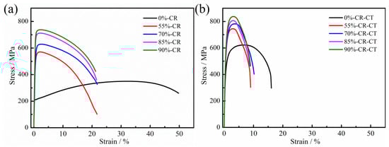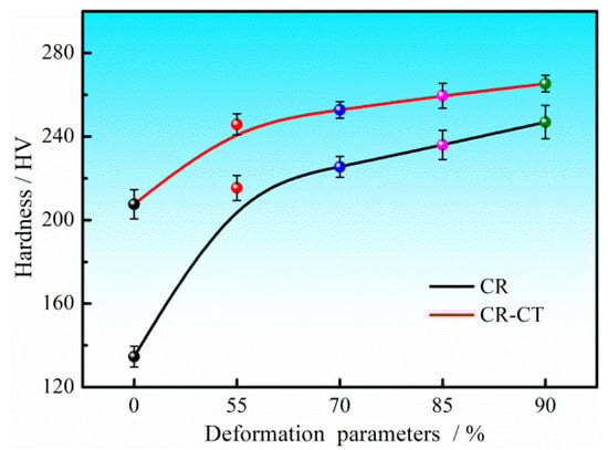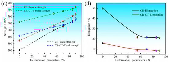Figure 9 displays the engineering stress–strain curves and property parameter variation curves of the CR and CR–CT samples. The yield strength and tensile strength of CR and CR–CT samples increase with the increase of deformation, but the elongation decreases. Compared with 0%-CR and 0%-CR–CT samples, the yield strength of 90%-CR and 90% CR–CT samples increased by 226% and 54%, respectively, and the elongation decreased by 58% and 46%, respectively. The tensile strength of the CR–CT sample is higher than that of the CR sample, but its elongation is relatively low. It is worth noting that the yield strength of the CR–CT sample is higher than that of the CR sample when the deformation is less than 85%. Compared with the 0%-CR sample, the yield strength of the 0%-CR–CT sample increases by 104%. However, the yield strength of the CR–CT sample is slightly lower than that of the CR sample at a deformation greater than 85%. Compared with the 90%-CR sample, the yield strength of the 90%-CR–CT sample reduces by 2%.
