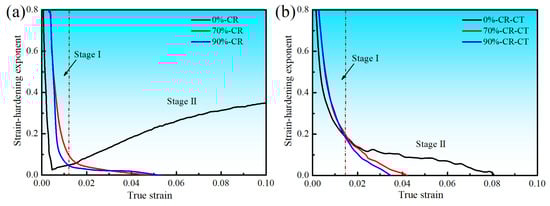 The strain hardening exponent curves of the CR and CR–CT samples. (a) CR samples and (b) CR–CT samples.