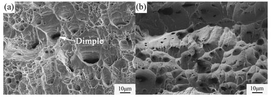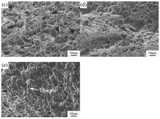 SEM images of the tensile fractures of the test steel after cold rolling and cryogenic treatment: (a) 0%-CR–CT; (b) 55%-CR–CT; (c) 70%-CR–CT; (d) 85%-CR–CT; (e) 90%-CR–CT.