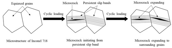 Total fatigue life consists of the crack initiation life and crack propagation life. The fatigue crack initiation mechanism of polycrystalline metallic materials is shown in Figure 1 [11,12]. Firstly, dislocations accumulate within grains under cyclic loading. Subsequently, persistent slip bands are formed in the grains. Microcracks are generated from the persistent bands as cyclic loading proceeds. As cyclic load proceeds further, the microcracks expand to surrounding grains due to the stress concentration at the crack tips. Finally, microcracks accumulate and are transformed to a macrocrack [13,14]. The formation of persistent slip bands and microcracks within Inconel 718 was observed using the replica method [15].