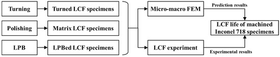 In this study, the LCF life of Inconel 718 with different surface integrity was researched using theoretical and experimental methods. The micro–macro FEM model was established based on the fatigue crack initiation and propagation mechanisms. The LCF life of the turned specimen, polished matrix specimen, and LPBed specimen was predicted using the proposed model. The LCF experiment was conducted to validate the proposed model. The conclusions are emphasized as follows:
