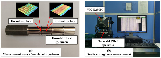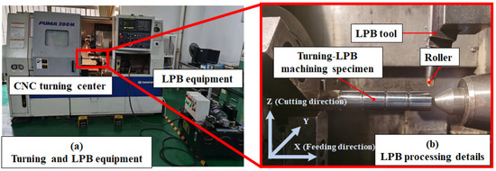 The turning and LPB process is shown in Figure 3. The turning and LPB process were carried out on CNC turning center PUMA 200 MA (DAEWOO, Incheon, Republic of Korea). Coated carbide inserts VBMT160404-MF1105 (Sandvik, Sandviken, Sweden) were utilized for turning. The following turning parameters were applied: turning cutting speed v = 50 m/min, feed rate f = 0.1 mm/r, turning depth ap = 0.1 mm. The turned specimen was subjected to LPB process. The following LPB parameters were applied: LPB speed v = 50 m/min, feed rate f = 0.1 mm/r, LPB pressure P = 15 MPa, LPB times N = 2.