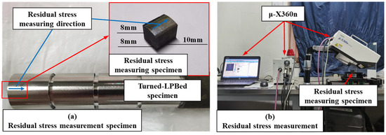 The rsidual stress measuring process is shown in Figure 5. The residual stresses measuring specimens were machined using wire electrical discharge machining, as shown in Figure 5a. The residual stress was measured along feed direction since its significant effect on fatigue property [25]. The residual stresses were measured using the X-ray residual stress analyzer μ-X360n (Pulstec, Shizuoka, Japan). In order to measure residual stresses at different depths, the specimens were subjected to layer-by-layer stress-free electrolytic polishing using electrolytic polisher DPF-2 (Zhunquan, Shanghai, China). Saturated NaCl solution (mass fraction 26.5%) was used for electrolytic polishing. The removal depth was measured using a micrometer screw. The residual stress measuring process is shown in Figure 5b.