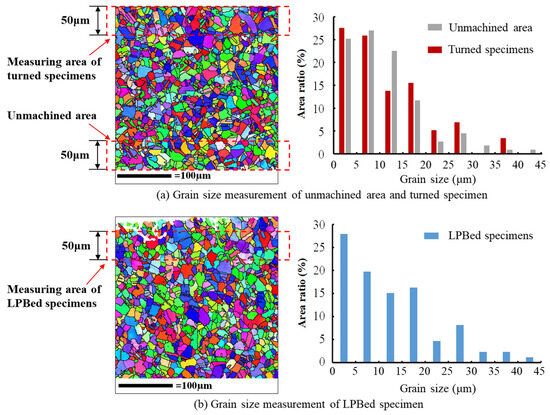 Firstly, the microstructure and grain size of the specimens were measured using electron backscatter diffraction (EBSD), as shown in Figure 7. The grain size was measured within a range of 50 μm from the machined surface excluding poorly identified areas in order to prevent the errors from the substrate material and poorly identified area. The microstructure of Inconel 718 was composed of equiaxed grains and crystal twin. The grain average size in the unmachined area, turned specimen, and LPBed specimen were measured as 12.27 μm, 12.26 μm, and 13.42 μm, respectively.