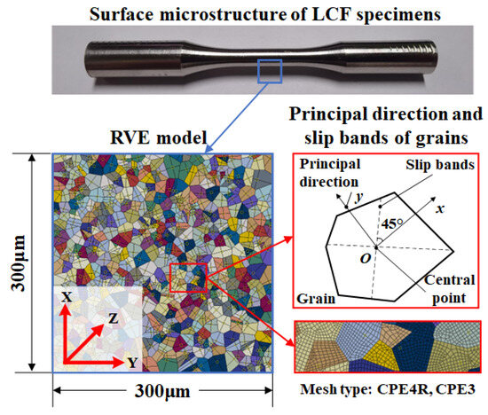 According to the Tanaka–Mura crack initiation cycle slip theory, cracks initiate at the persistent slip bands internal to the grains. Therefore, the slip bands were drawn inside the grains at an angle of 45° to the main direction, as shown in Figure 8. The length of the slip bands and shear stress amplitude was substituted into the Tanaka–Mura model to calculate the crack initiation life of the grain. The RVE model was meshed using CPE4R and CPE3 with the size of 1 μm. The established RVE model of Inconel 718 is shown in Figure 8.