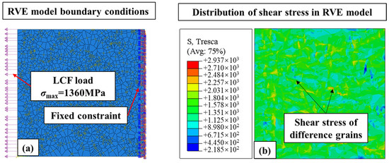 The boundary conditions were specified based on the surface integrity of the fatigue specimen and the LCF experiment. The maximum load was σmax=1360 MPa and R=0.1 for stress ratio. The fixed constraint and load were applied to the RVE model as shown in Figure 9a. The distribution of shear stress in the RVE model is shown in Figure 9b. The shear stress was uniformly distributed within each grain while varied between different grains. It was due to the anisotropic mechanical properties of the grains.
