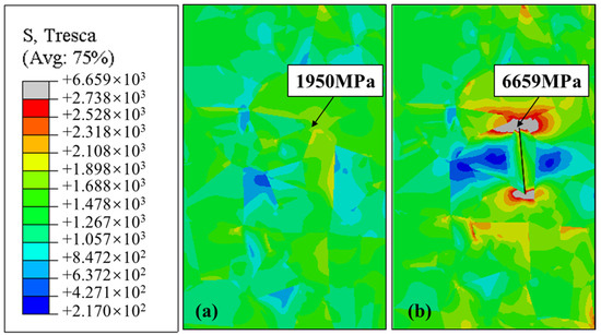 Shear stress distribution of RVE model (a) without crack and (b) with crack.