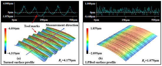 The surface integrity of the specimens was measured experimentally in Section 2.2. The surface morphology and surface roughness of the turned specimen and LPBed specimen are shown in Figure 11. As shown in Figure 11a, tool marks were observed on the turned surface. The surface roughness of the turned specimen was 4.179 μm. Tool marks were smoothed after the LPB process as shown in Figure 11b, and the surface roughness was decreased to 1.079 μm. The LPBed surface roughness was reduced by 77.6% compared to the turning results.