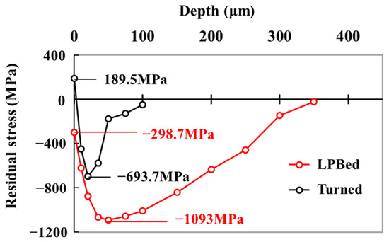 The residual stress field of the turned and LPBed specimens is depicted in Figure 12. Tensile residual stress with the value of 189.5 MPa was induced on the turned surface. The maximum compressive residual stress of turned specimen was −693.7 MPa. The depth of the turned residual stress field was 100 μm. The surface compressive residual stress of the LPBed specimen was −298.7 MPa. The maximum compressive residual stress of LPBed specimen was measured at 50 μm from the surface with the value of −1093 MPa (57.6% increasing compared with turned specimen). The depth of the LPBed residual stress field was 350 μm.