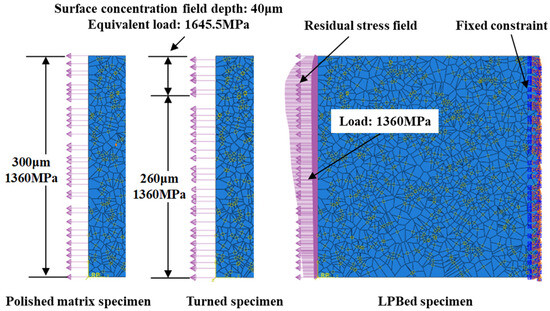 The actual stress on the turned specimen surface was 1645.5 MPa and 1360 MPa internally in the specimen. The compressive residual stress was applied to the LPBed specimen according to the measurement result shown in Figure 12. The boundary conditions for polished matrix, turned, and LPBed RVE models are shown in Figure 14.