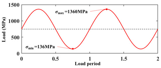 The crack propagation life of the specimens was predicted using the XFEM finite method. The 3D XFEM model was established based on the fatigue specimen structure, as shown in Figure 15. The initial crack with a smooth curved front was formed after the crack initiation stage [38]. A semi-circular crack with the radius of 0.3 mm was set up in middle of the model. Hexahedral meshes are the only suitable mesh for XFEM. The model was meshed using C3D8R with a size of 0.15 mm to ensure convergence of XFEM simulation. The material parameters of Inconel 718 crack extension finite element analysis are shown in Table 5. The cyclic loading analysis step was used to simulate LCF cyclic loading process. A fixed constraint was set on the bottom of the model. The freedom of the upper surface was constrained, except the z-direction displacement. A sinusoidal load was applied to the model. The maximum load σmax = 1360 MPa, the stress ratio R = 0.1. The LCF load spectrum is shown in Figure 16.