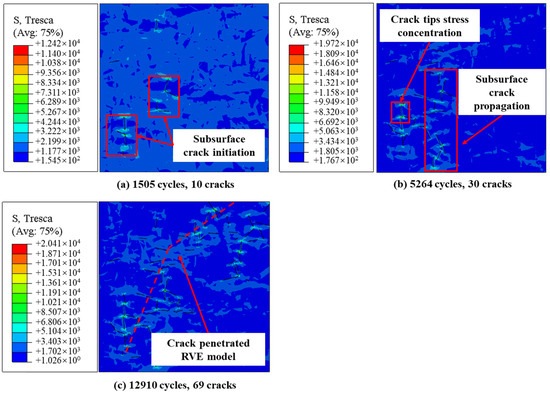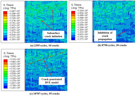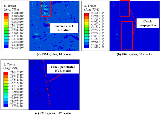 The crack initiation process of the polished matrix specimen simulated using FEM is shown in Figure 17. Microcracks were initiated in subsurface grains when loaded after 1505 cycles, as shown in Figure 17a. This was attributed to the absence of the surface stress concentration on the polished matrix specimen surface. The microcracks gathered and propagated to the surface with load proceeding, as shown in Figure 17b. The microcracks penetrated the RVE model after 12,910 cycles, as shown in Figure 17c. The predicted crack initiation life for the polished matrix specimen was 9718 cycles.