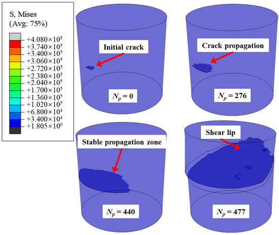 The XFEM model predicted crack propagation life is shown in Figure 20. The crack extended slowly perpendicular to the load at the beginning of the crack propagation stage. This was due to the lower intensity factor. As the crack length increased, the crack propagation accelerated as the stress intensity factor increased. The shear lip formed at the end of the crack propagation was attributed to ductile fracture. The XFEM-predicted crack propagation life Np of Inconel 718 was 477.