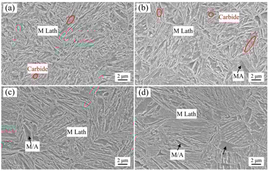 Figure 2 shows the matrix microstructure of the sample quenched at 860 °C~950 °C and tempered at 400 °C, which consists of lath martensite and a small martensite−austenite island (M/A) made of retained austenite (consistent with the organizational characteristics in reference [7]). When the austenitizing temperature is lower than 920 °C, there are undissolved carbides (red circle) between the martensite laths and the boundary of martensite laths becomes blurred, as can be seen in Figure 2a,b. When the austenitizing temperature is increased to 920 °C or above, the carbides between the laths become greatly reduced, and the lath boundaries gradually become clearer. The laths in the martensite blocks tend to be arranged in parallel, the original austenite grain size increases, and the martensite laths become coarser. As the austenitizing temperature increases, the degree of undercooling increases, and the phase transformation temperature decreases, resulting in an increase in retained austenite during quenching (black arrow).