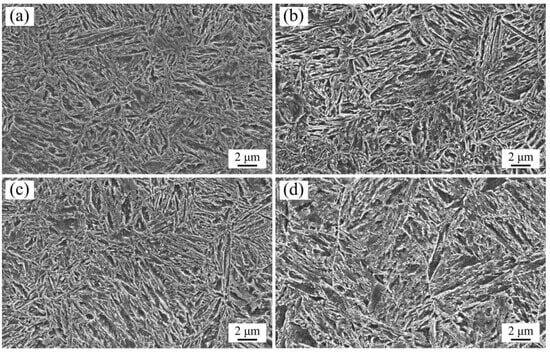 SEM micrographs of the experimental steel after quenching at 890 °C and tempering at different temperatures: (a) Q-T300 (b) Q-T350; (c) Q-T400; (d) Q-T450.