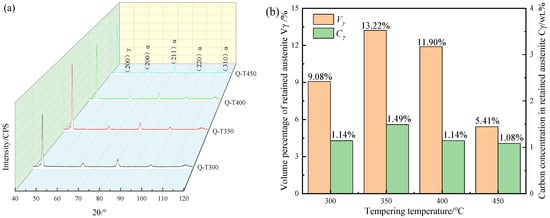 Figure 4a shows the XRD diffraction pattern of the experimental steel after tempering at different temperatures. The amount of retained austenite Vγ and the carbon content Cγ in the retained austenite in Figure 4b are obtained from the diffraction results and Equations (4)–(6). According to Equation (1), the volume fraction of retained austenite (Vγ) can be calculated using the (200)α, (211)α, (200)γ, (220)γ, and (311)γ diffraction peaks [30]: