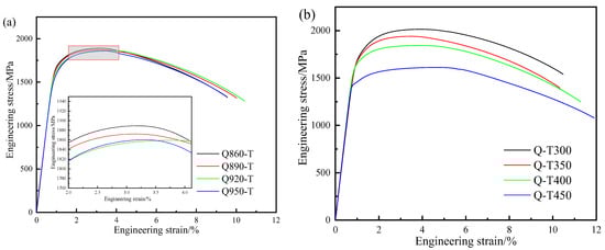 The engineering stress−strain curves of the experimental steel for different austenitizing temperatures and tempering temperatures. (a) Austenitizing temperature and (b) tempering temperature.