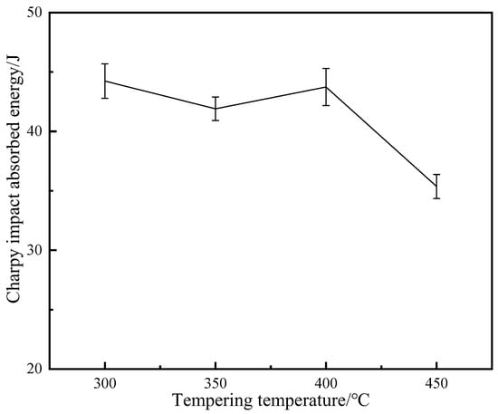 During tempering, the retained austenite and its carbon content also undergo dynamic changes. When the tempering temperature increases from 300 °C to 350 °C, the carbon atoms in the supersaturated martensite diffuse into the untransformed austenite, increasing its stability; thus, so the retained austenite content increases [37,38]. When the tempering temperature is higher than 350 °C, the microalloying elements diffuse, causing the precipitation of carbides to increase, the carbon content to decrease, the Ms point to increase, and the retained austenite to decompose. Research in Ref. [39] has shown that film-like retained austenite can hinder crack propagation and improve toughness. When the tempering temperature increases from 400 °C to 450 °C, the retained austenite content is the lowest, only 5.41%, and the number of carbide precipitations in the matrix is the largest. When subjected to impact deformation, the precipitation of carbides is inconsistent with the deformation of the matrix, which can easily cause cracks. Moreover, the residual austenite content and the number of high-angle grain boundaries are small, making it difficult to hinder the expansion of cracks. Figure 8d shows that there are holes formed by the falling of large particle inclusions, a large number of cleavage planes, and tearing edges on the impact fracture surface. The impact energy is greatly reduced to 35.4 J, and tempered martensitic brittleness appears at this time.
