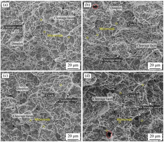 SEM micrographs of the impact fracture surfaces. (a) Q-T300; (b) Q-T350; (c) Q-T400; (d) Q-T450.