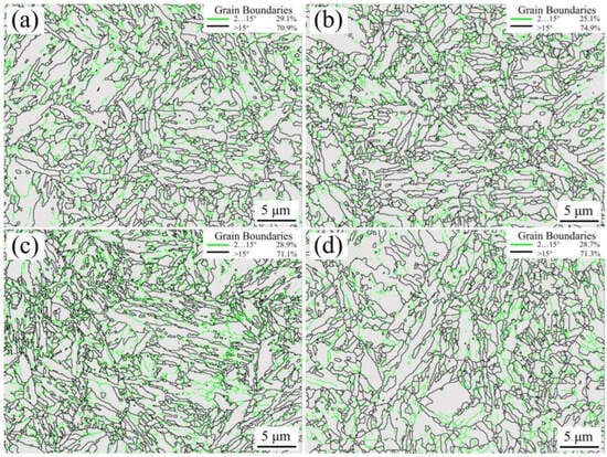 The room temperature Charpy impact energy at different tempering temperatures was plotted in Figure 6, which shows that as the tempering temperature increases, the impact energy has a wavy decreasing trend. The impact energies absorbed for the Q-T300 and Q-T400 specimens are 44.2 J and 43.7 J, respectively. The two values are very close. When the tempering temperature is 450 °C, the impact energy shows a significant decrease, dropping to 35.4 J. Based on this inference, it is possible that there may be structural defects in the steel that have an adverse effect on its toughness, such as large particle inclusions. Figure 7 shows the impact fracture morphology of experimental steel after tempering at different temperatures. In Figure 7a,c, there are numerous cleavage planes (black arrows) and a small number of smaller and shallower dimples, with a few micropores (yellow circles) and cleavage steps (white arrows). In Figure 7b, in addition to a small number of ductile dimples and a large number of cleavage planes, there are also secondary cracks (white circles) and holes formed by the drop of large particle inclusions (red circles), which lead to a decrease in the impact energy to 41.9 J; in Figure 7d, a large number of cleavage planes are distributed, with almost no dimples observed. At the same time, secondary cracks and large-sized pores appear, which further deteriorate the impact toughness. Figure 8 shows the GB graph of the experimental steel after tempering at different temperatures, and Figure 9 shows the statistical graph of the proportion of grain boundaries in different tempered samples. According to the scatter plot in Figure 9, the Q-T350 sample has the highest proportion of high-angle grain boundaries at 74.9%, while the proportion of high-angle grain boundaries in the other samples is around 71%, with little difference. Through comprehensive consideration of mechanical properties and impact toughness, it can be considered that 400 °C is the optimal tempering temperature.