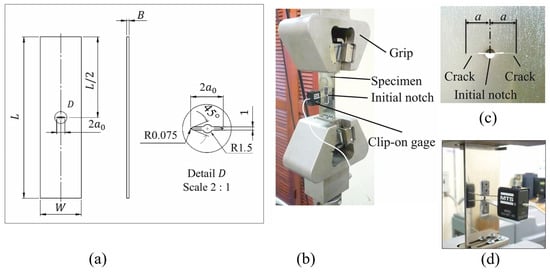 For the fatigue tests, a MTS servo-hydraulic test system is utilized along with a 5 mm clip-on gauge (MTS 632.02F) to measure the crack size, as depicted in Figure 1b,d. The servo-hydraulic test system incorporates MTS software that calculates the crack size based on measurements of crack-mouth-opening displacement. The crack sizes estimated by the test system are further verified through direct optical measurements (Figure 1c).
