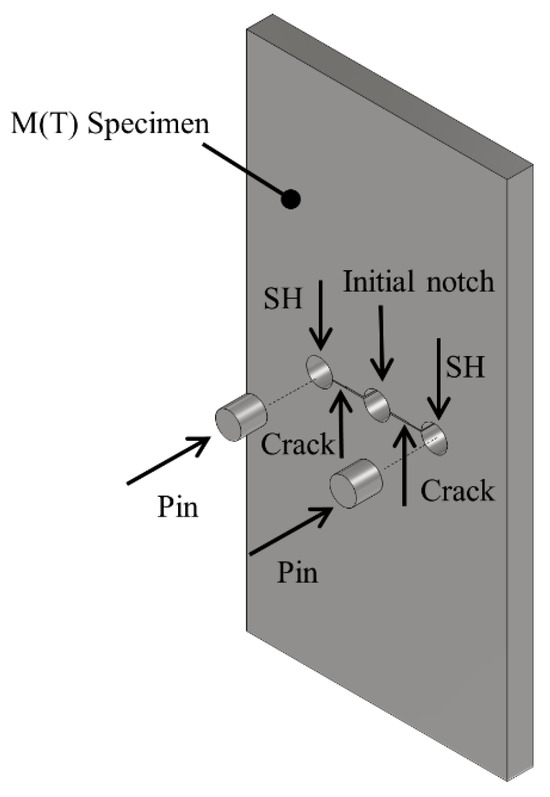 The expanded SH specimen is shown in Figure 2, prior to pin insertion. Circular stop holes with diameters of 3 mm are drilled meticulously at the crack tips of the initial M(T) samples (a manual drill is employed for this process). The bit is carefully centered at the respective crack tips of the initially cracked M(T) samples. Subsequently, pins with a diameter of 3.175 mm are carefully inserted into the holes using a hydraulic press. Then, the FCG test of the specimen with the inserted pins is restarted and the fatigue crack is allowed to grow until the specimen ultimately fractures. The total number of cycles endured until fracture is recorded.