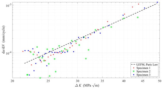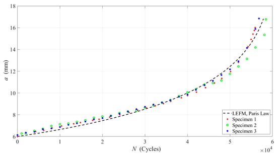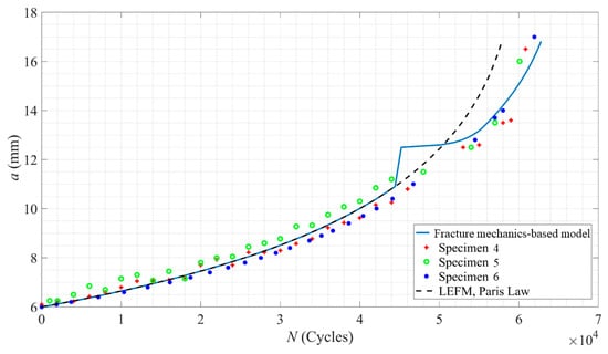 where the applied force range is for a stress ratio of . The crack length is estimated by integrating Equation (2), and it is plotted in Figure 3 along with the experimentally measured data. The FCG rates are computed using Equation (2) and plotted in Figure 4 with the results that are obtained by means of the FCG tests. The best fit for the Paris’ equation is achieved with and . These parameters yield the closest agreement between the model predictions and the experimental data.